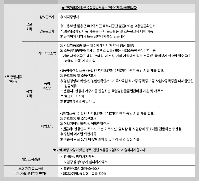 이 외에 근로형태에 따른 소득증빙서류는 아래 표를 통해 확인해 보시길 바랍니다!