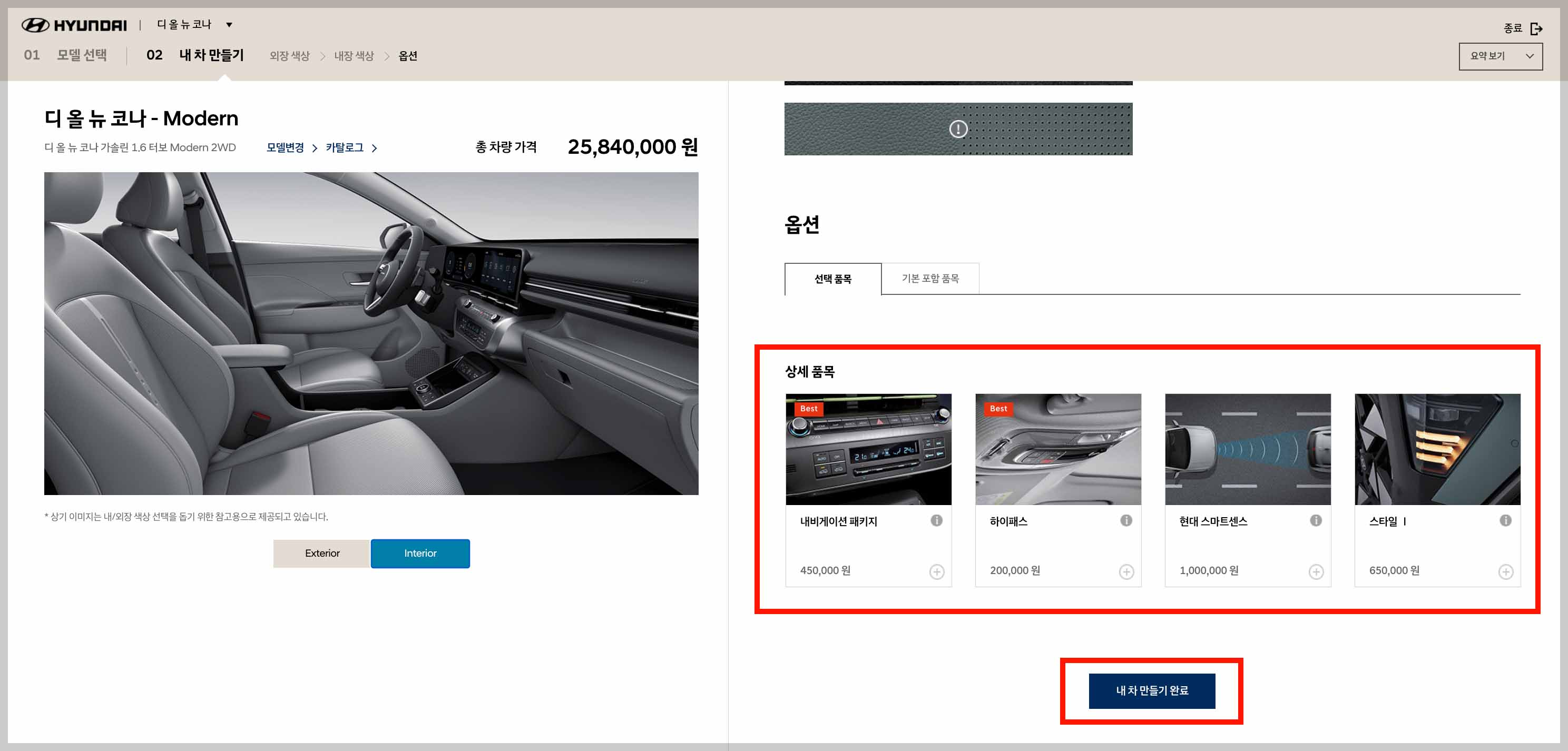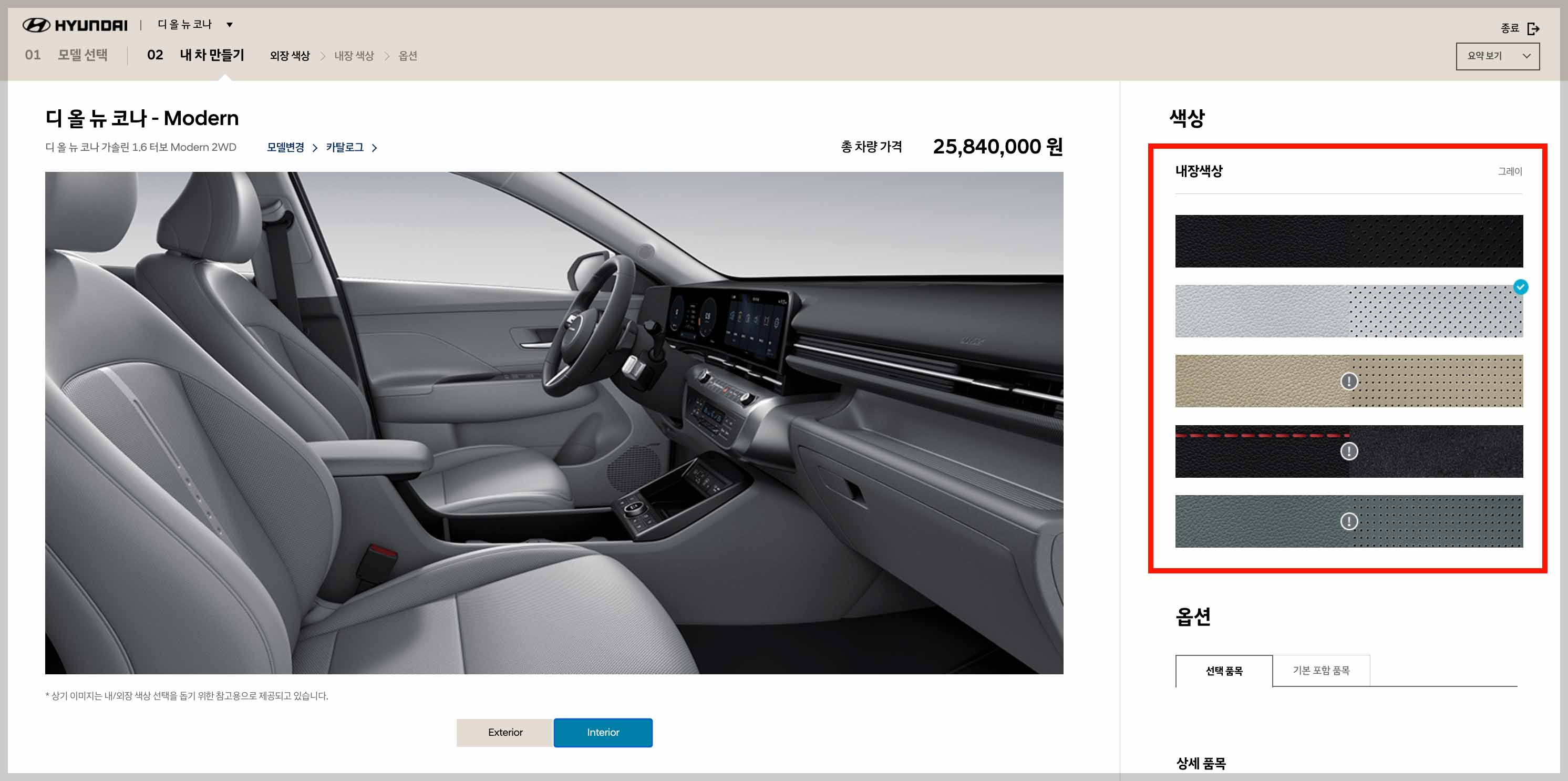 모델 선택 ▶ 외장 및 내장 색상 선택 ▶ 옵션 및 액세서리 선택 ▶ 상세 견적 만들기 ▶ 구매 신청하기