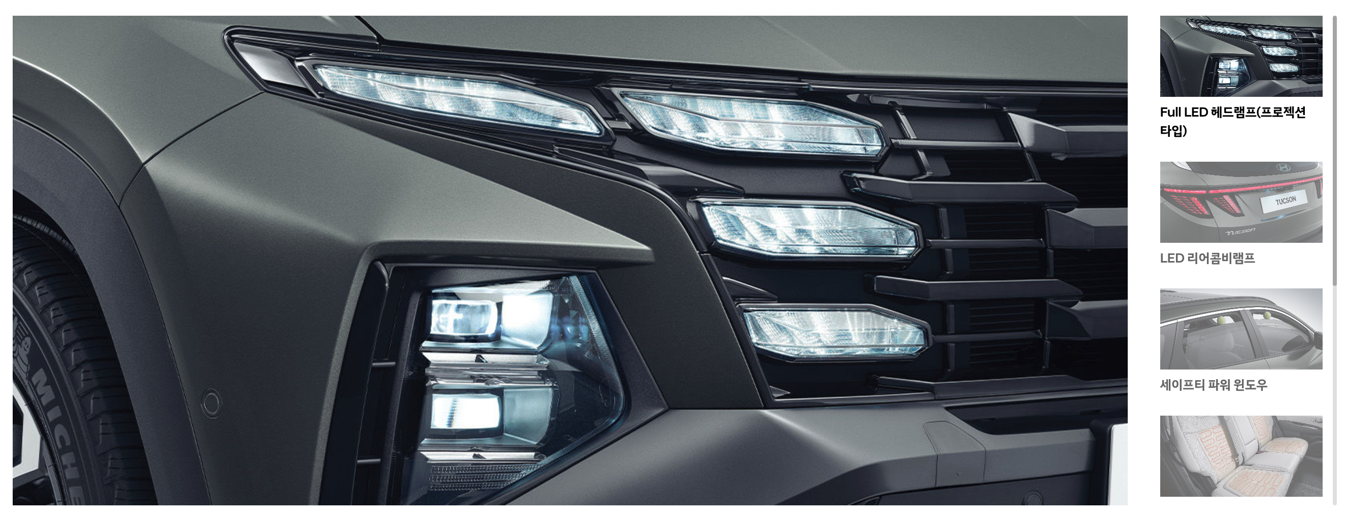 외부 디자인 역시 눈에 띄는 점이 많았는데요, 대표적으로는 Full LED 헤드램프와 LED 리어콤비램프, 그리고 세이프티 파워 윈도우가 눈에 띄었습니다.