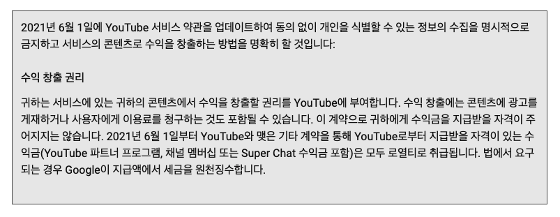 이렇게 총 세 가지인데요, 저희는 두 번째 항목인 '유튜브의 수익 창출 권리'에 대해 짚어보겠습니다.