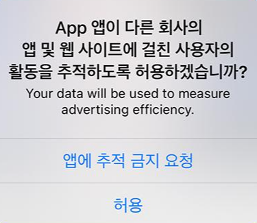 그리고 사용자의 활동 데이터 추적을 활용한다는 점이 점점 문제 되면서 애플은 기기에 깔린 앱이 사용자의 활동 추적을 제한하는 서비스를 내놓았는데요, 아이폰을 쓰는 분들은 최근에 이런 메시지를 자주 접하셨죠?