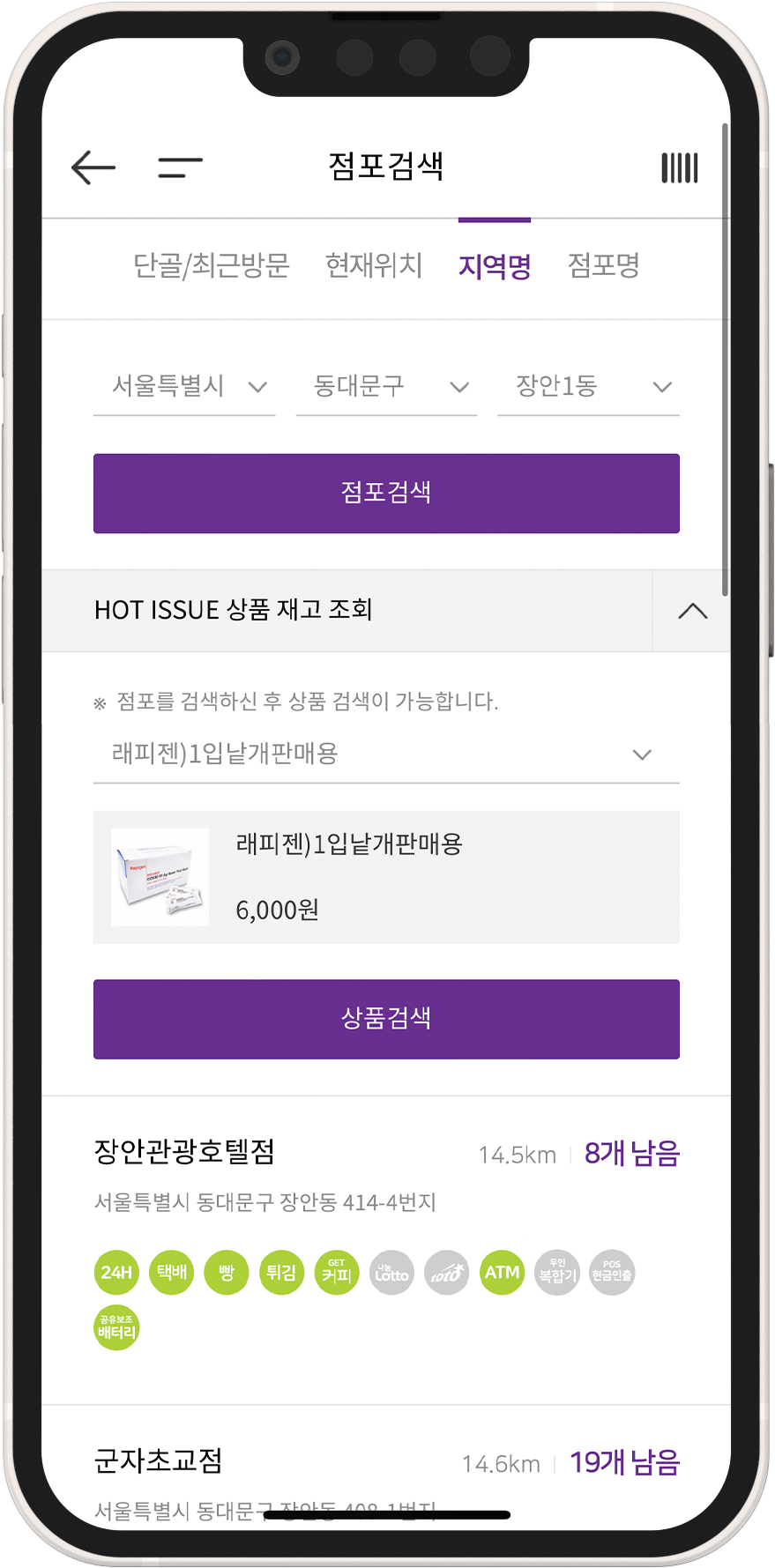 자가진단키트의 재고 수량뿐만 아니라 본인 위치에서 해당 편의점까지의 거리 혹은 이용 가능한 서비스에 대한 정보도 함께 확인할 수 있습니다.